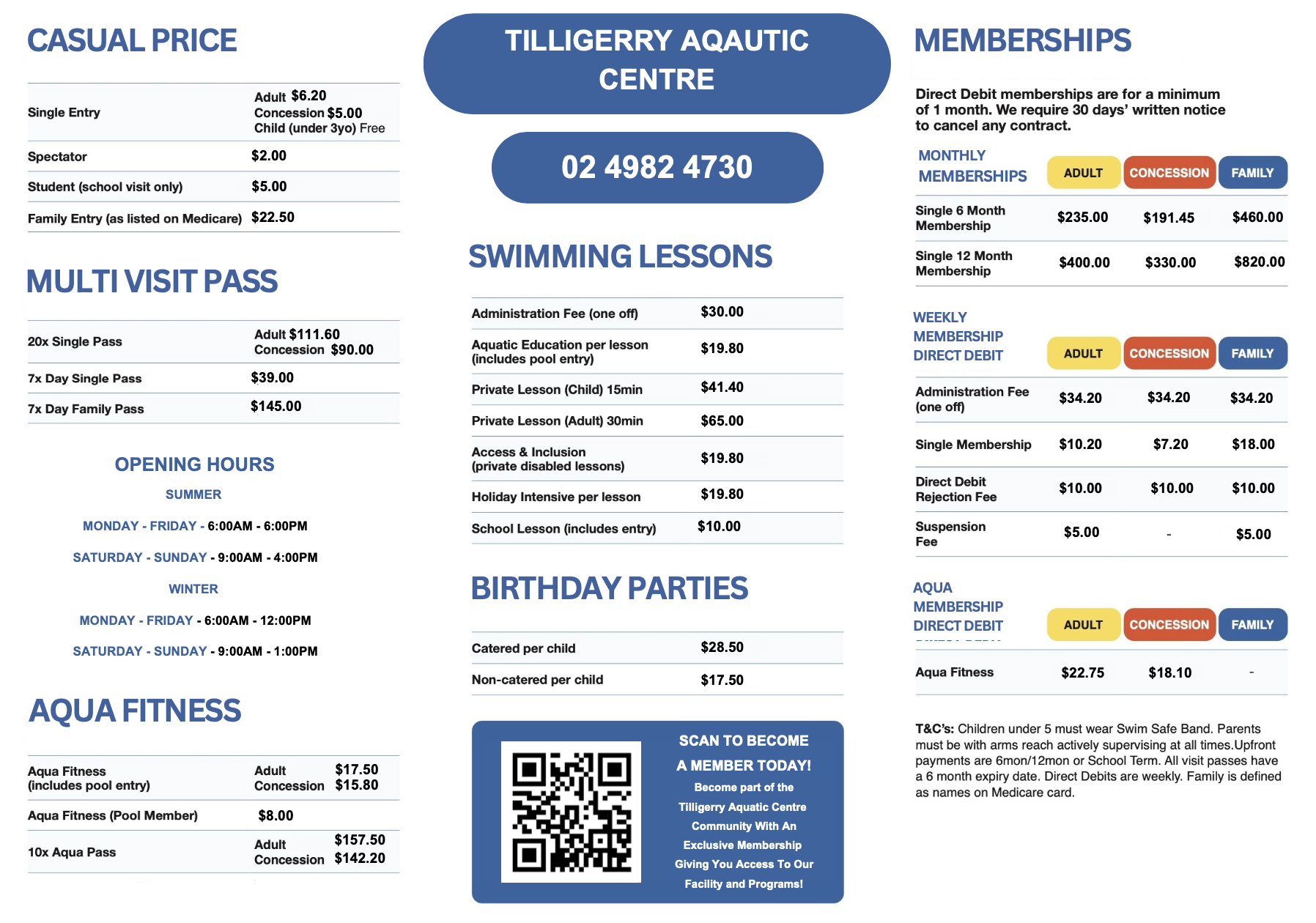 Weekly direct debit with access to our heated pool and Aqua Aerobics classes.